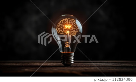 A digital illustration of a glowing brain inside a clear light bulb against a dark background with floating sparks. Creative Idea concept symbolizing innovation, solution.