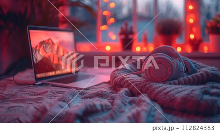 The comforts of home come alive in this relaxing workspace scene with a laptop and headphones set against a backdrop of warm, ambient lighting.