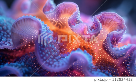 Abstract neon-glowing, jellyfish-like coral forms in a deep-sea environment.