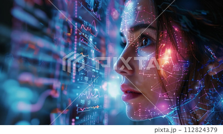 A woman interacts with a futuristic holographic interface full of data visualizations, symbolizing cutting-edge analytical technology.