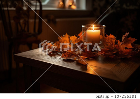 Autumn atmosphere, candles and autumn leaves on a wooden table