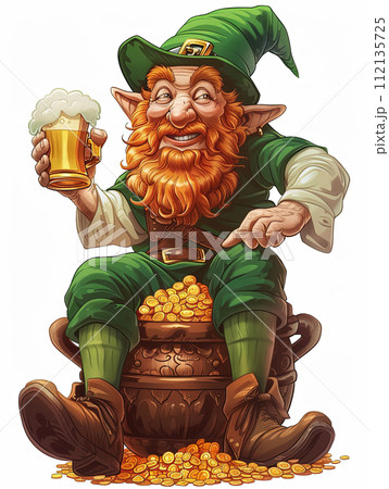 A cartoon leprechaun with a mug of beer sits on a pot of gold. Illustration for St. Patricks Day