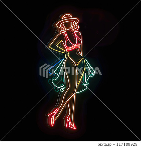 Glowing multi-colored neon sign in the form of a young sexy woman in a revealing outfit