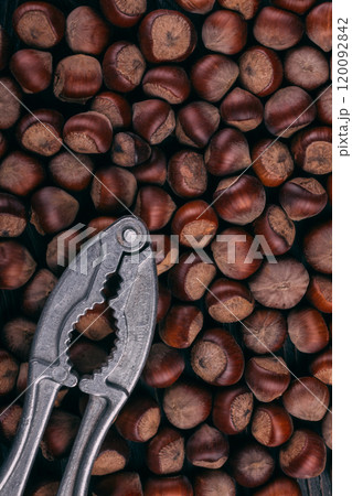 Nutcrackers are lying on a pile of hazelnuts. Background