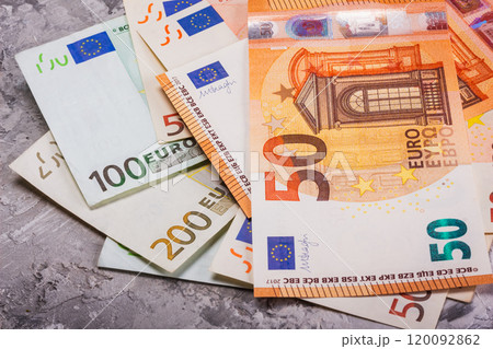 A large pile consisting of numerous 50 Euro Banknotes an abstract background representing currency