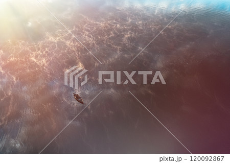 Sunrise with beautiful sunlight on river on which fisherman sails on boat