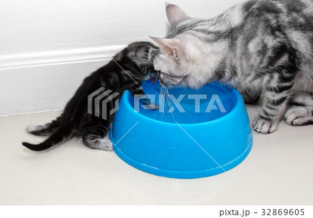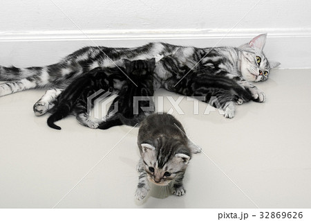 American shorthair cat family. Mom cat with kitten