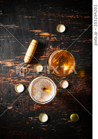 Beer in glasses and bottle opener.