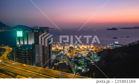 Twilight light reveals Central skyline from Tai Sheung Tok