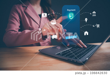 Woman using smartphone online payment with icons on virtual screen, mobile banking and online shopping. Technology online banking applications via. Digital online payment, financial transaction.