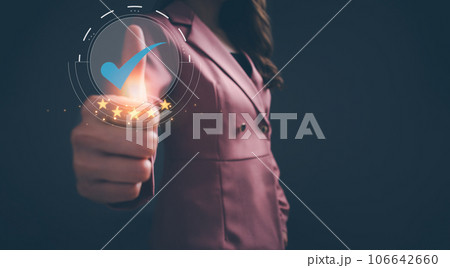 Businesswoman operating with quality assurance, guarantee, standards, ISO certification, standardization, top service, top quality service. Guarantee Standards quality control certification concept.