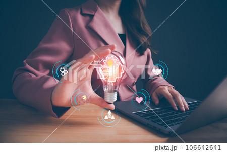 Businesswoman holding light blub with virtual Global Internet connection. Woman use computer to searching for information. Concept of inspiration creative smart thinking and innovation with network.