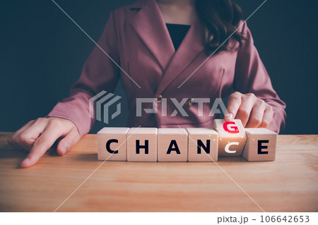 Businesswoman hand flipping wooden blocks with CHANGE to CHANCE text. Economy investment business crisis, technology transformation can make good chance, strategy, solution, positive thinking concept.