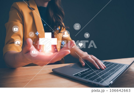 Woman hand holding plus icon for the healthcare medical icon. Health care, access to welfare health and medical Insurance for your health concept.