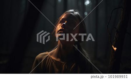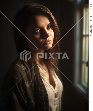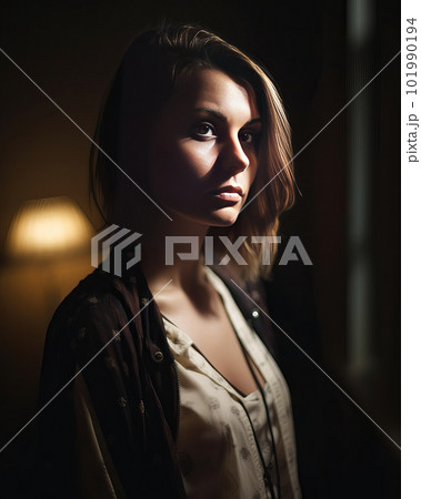 Beautiful young woman standing in a bedroom - dark moody atmosphere - made with Generative AI