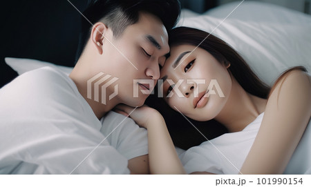 Beautiful Asian woman lying on the bed - close up of the face - made with generative AI tools