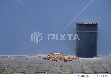 Trash can and a pile of garbage in the city yard.