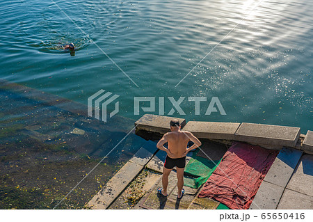 Chinese people swimming in the Hai River
