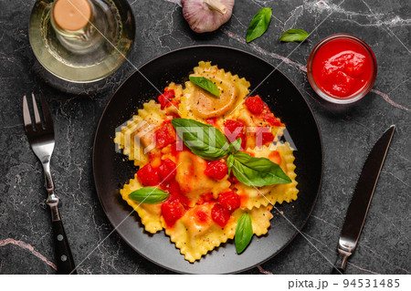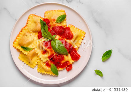 Delicious appetizing ravioli with tomato sauce and basil