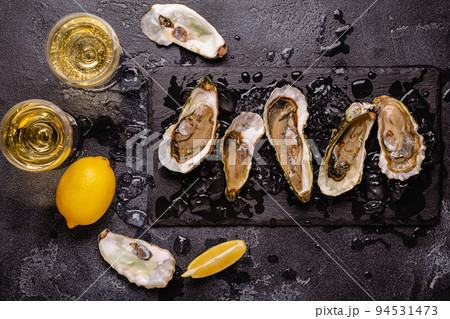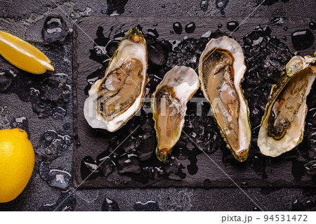 Opened fresh oysters on a plate, served with lemon and ice.