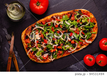 Homemade vegan pizza with tomatoes, peppers, olives, onions and herbs.