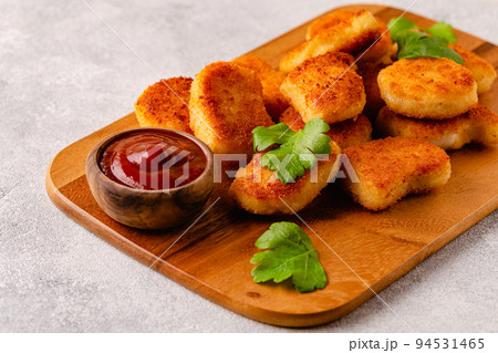 Fried crispy chicken nuggets on a wooden serving board.
