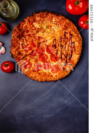 Pizza with different toppings - pepperoni, cheese, margarita, barbecue