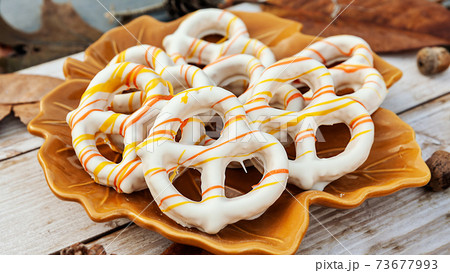 Glazed pretzels on the plate with autumn setup, season holiday concept