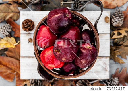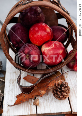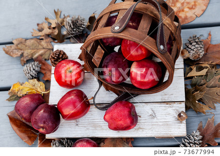 Harvest of red apples in a basket in autumn season, fresh organic fruits on wooden background
