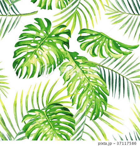 Tropical leaves green seamless white background