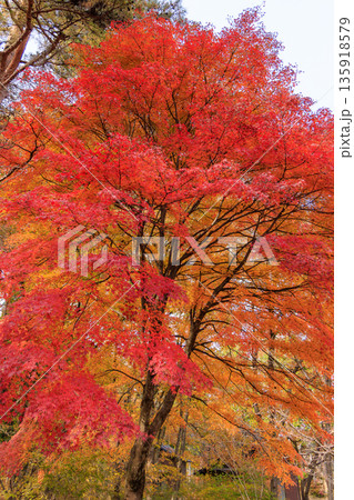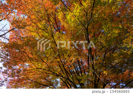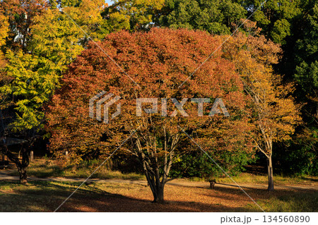 秋日公園裡,晨曦灑在樹上美麗的秋葉上。
