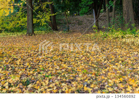 秋日公園裡,落葉鋪成一片金黃色的地毯。