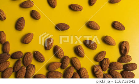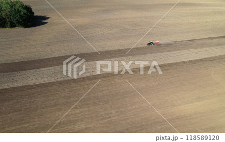 Aerial view of a tractor working on a vast plowed field, preparing the soil for planting