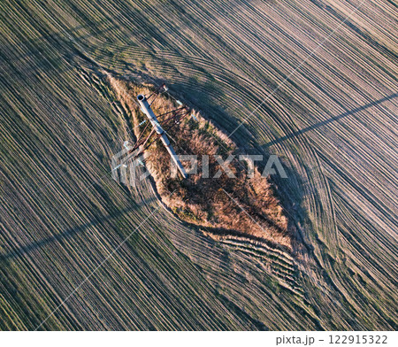 Aerial: tractor cultivates farmland near the river. Problem of freshwater pollution