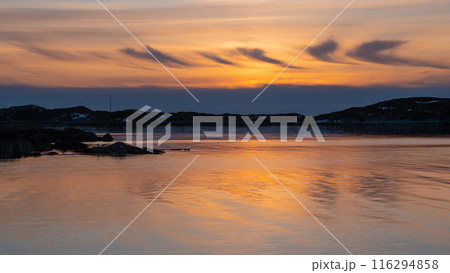 Fabulous sunset over the rocky shore of the North Sea in Norway