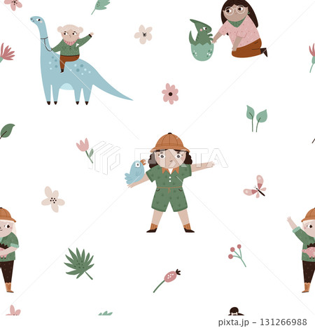Dinosaur Adventure Seamless Pattern. Kids' Dino and Girl Print