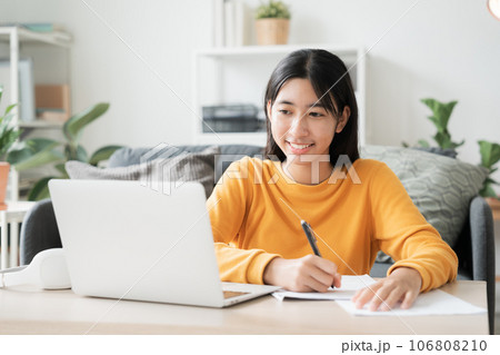 Happy Asian girl smile on the face, Asia student learning online on laptop at home.