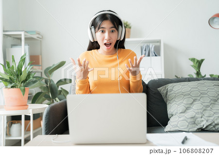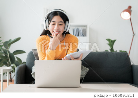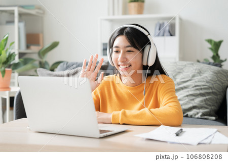 Happy Asian girl video call online via internet tutor on laptop computer with headphone