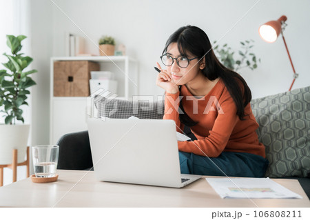 Asian woman noting down important information working at home, Asia businesswomen using computer