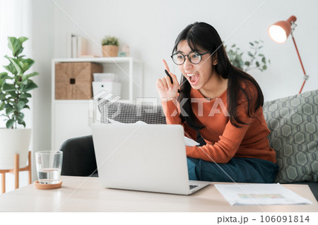 Asian woman wear glasses text work on laptop happy while sitting on sofa in living room at home