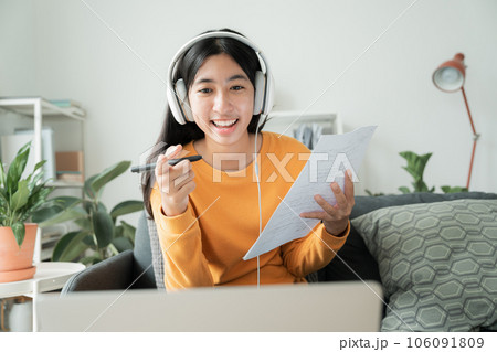 Happy Asian girl video call online via the internet tutor on a computer laptop with headphone