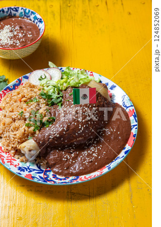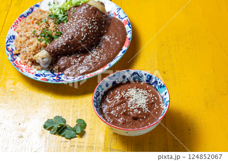 Mexican traditional mole poblano sauce and chicken with rice with mole poblano on yellow background