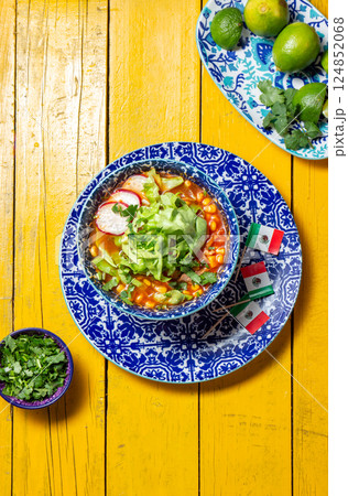 Delicious Pozole soup served in a colorful bowl with fresh toppings for Mexican Independence Day