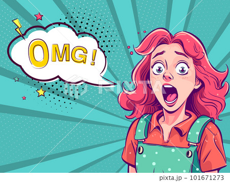 Surprised young pretty girl with open mouth in cartoon style and OMG speech bubble.