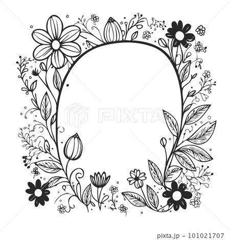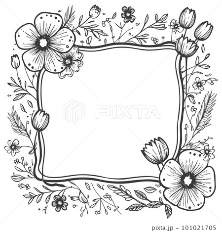Wreath of black flowers in doodle style on a white background. Square frame for text.