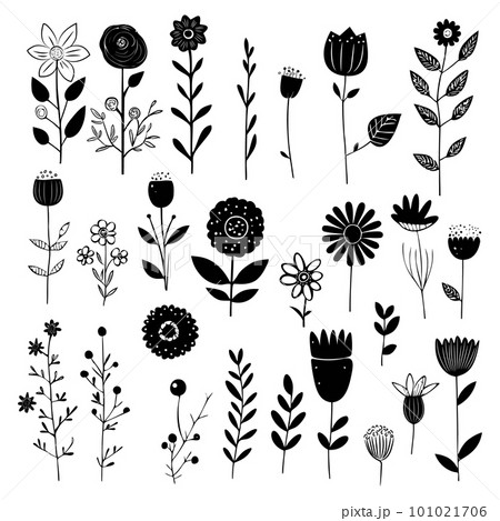 Vector Hand drawn floral elements, flower and leaves in doodle style