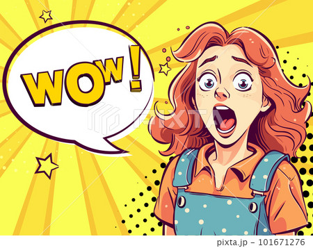 Surprised young pretty girl with open mouth in cartoon style and Wow speech bubble.