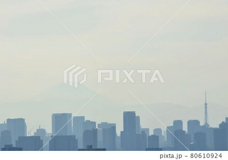 在大城市的建築物後面看到的富士山