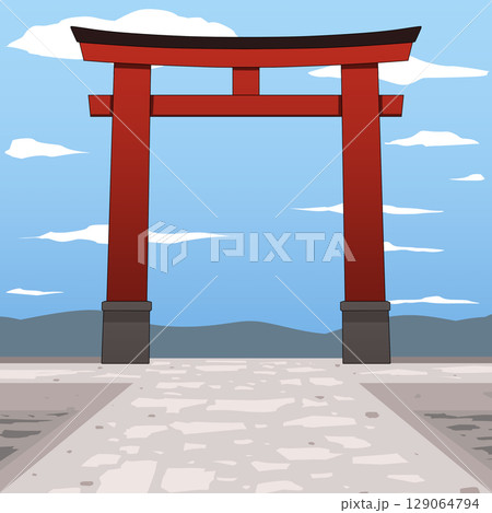 方形背景、手繪素材、簡單的鳥居和神社入口周圍的風景、抽象的背景插圖