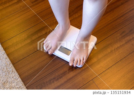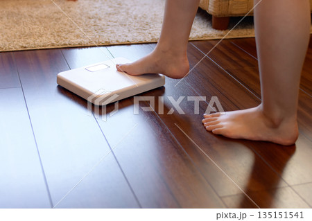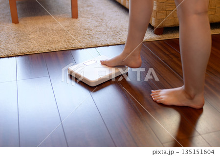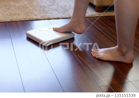 年輕女子在客廳秤體重,雙腳放在體重計上,身材苗條,體態勻稱。
